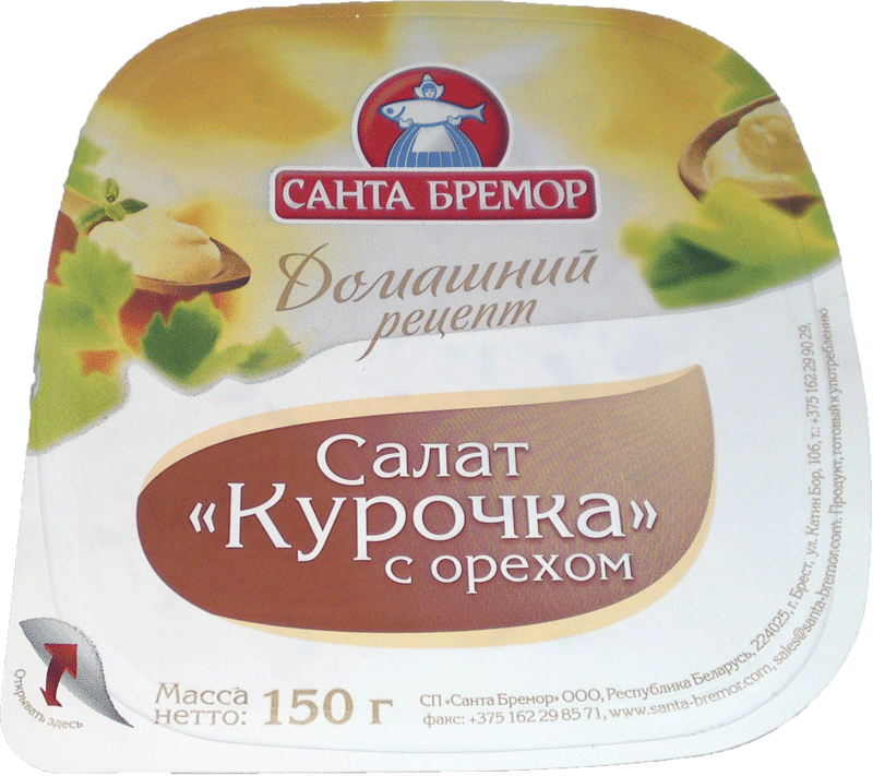 Страна производства:Беларусь Торговая марка:Санта Бремор Масса / Объем:0.15 кг Пищевая ценность на 100 г Белки 2.5 г Жиры 28 г Углеводы 6.5 г Энергетическая ценность 290 ккал/ 1210 кДж Описание Состав соус майонезный (вода, масло растительное, сахар, яичный желток, загустители: кукурузный крахмал, ксантановая камедь; соль йодированная, регуляторы кислотности: уксусная, молочная кислоты), колбаса вареная (мясо птицы, говядина, свинина, молоко сухое обезжиренное, усилитель вкуса и аромата глутамат натрия, специи, экстракты специй, антиокислитель аскорбиновая кислота, лактоза, ароматизаторы, краситель кармин, фиксатор окраски Е250), морковь, огурец консервированный, яблоки, орех грецкий, соус "Ворчестер", ароматизатор, консерванты: бензоат натрия, сорбат калия.